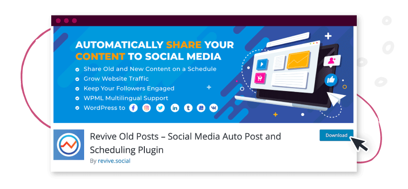WordPress users can take advantage of content repurposing WordPress plugins that can automate certain tasks. For example, there’s a free WordPress plugin called Revive Old Posts that automatically shares old and new posts to your social media pages.