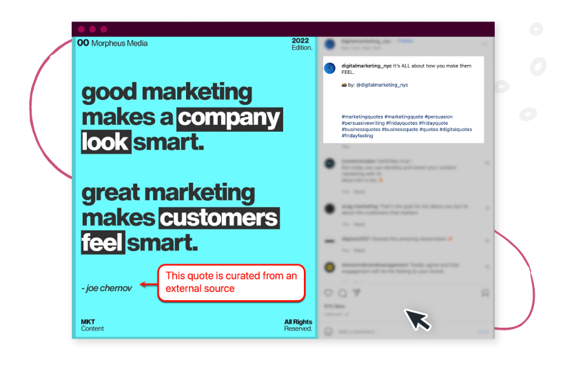 A perfect example is an image quote on Instagram, which curates wisdom from other sources and publishes it as original content.