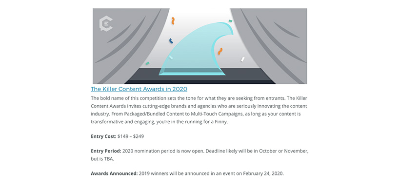 Next up is a content ladder I wrote about reputable marketing awards, 2020 Marketing Awards Your Brand or Agency Should Pursue. This list includes all of the details for 13 marketing awards opportunities. Entry costs, deadlines, and awards announcement dates are updated when a new award season kicks off.