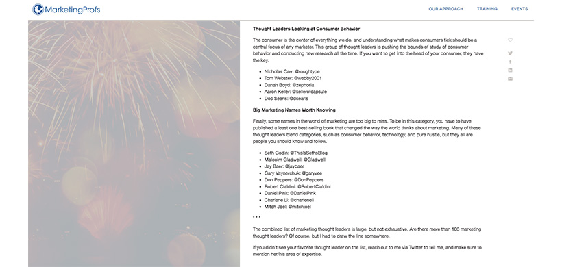 In this MarketingProfs opinion piece from Mat Sweezey of Salesforce, The Big List of 103 Marketing Thought Leaders by Category, you’ll find a well-organized list of thought leaders broken down by a wide range of marketing disciplines (search marketing, social media, B2B, etc.)