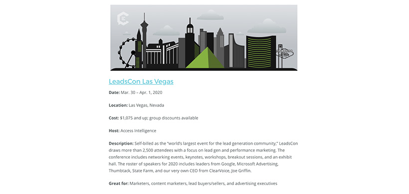 Several content ladders are top-performing posts on the ClearVoice blog, like this one, The Ultimate List of Marketing Conferences in 2020. This ladder content offers a comprehensive calendar of the top marketing conferences, which are updated after each conference. The number of featured conferences can change with each update.