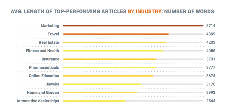 It’s easy to get caught up in the romance of bigger word counts, especially when you look at insights from SEMRush, which shows the formidable lengths of top-performing articles across industries. Bigger content doesn’t always mean better content. More important is to share useful information and allow that to dictate the length of the piece.