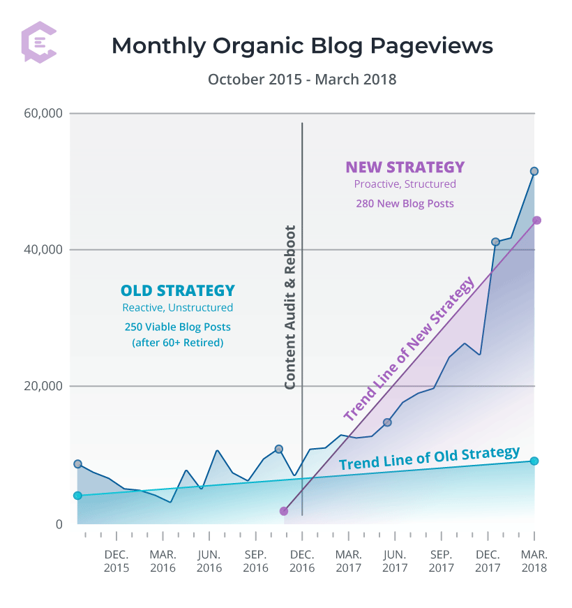 In this case study, I’ll share how we increased our monthly organic blog traffic 1,665%, from ~2,900 monthly pageviews at our low point to ~51,500 sustainable monthly pageviews (and still growing). I’ll review several of the key highlights from our content audit as well as a month-by-month progress report on our content strategy reboot.