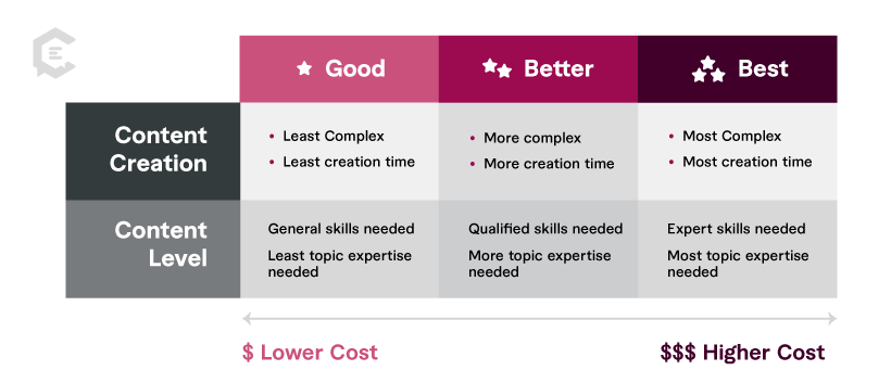 Our team has rated content type examples in three degrees of quality (Good, Better, Best) to help you better gauge resources needed for your content plan. In general, the degrees of content quality correspond to our three content levels (General, Qualified, Expert) based on the criteria below. Please consider there are multiple variables that could determine the cost, completion time, or content level for any content piece with a perceived degree of quality.