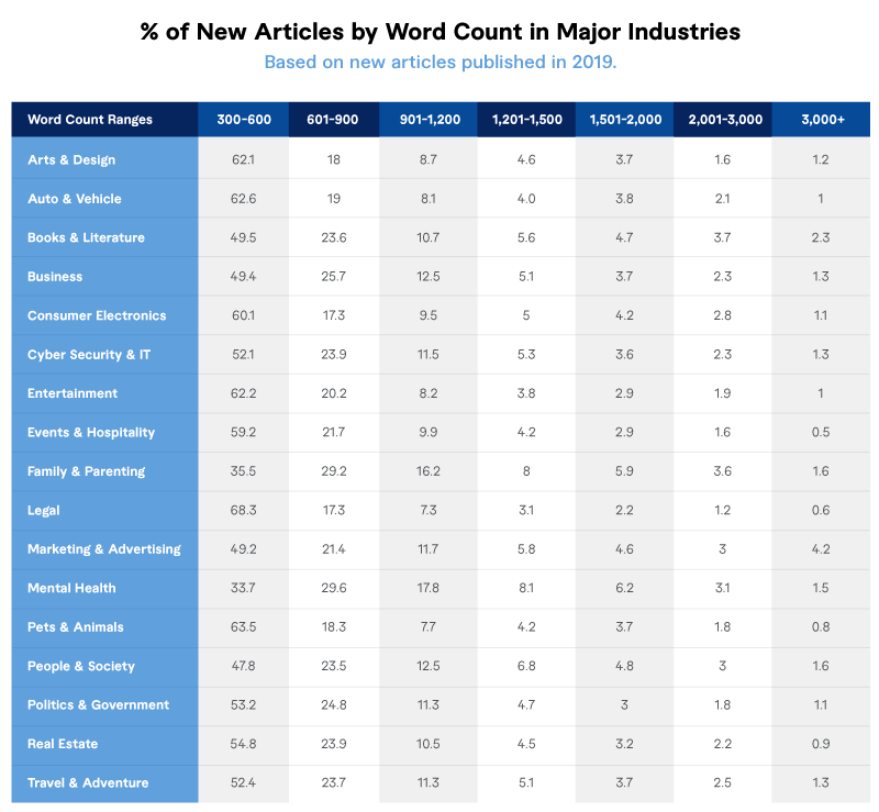 Notable findings: We chuckled when we saw the Marketing & Advertising and Books & Literature had the highest industry percentage of articles with 3,000+ words. While the former might already be on to the traffic bonanza of long-form content, the latter might just lend itself to longer content because writers writing about writing — well, it’s a perfect storm of wordiness.