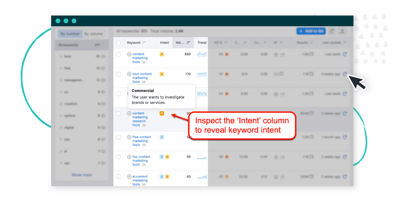 If the keyword’s intent is ambiguous, use tools like Semrush to clarify the intent. Look under the “Intent” column to identify whether the keyword is informational, transactional, commercial, or navigational.