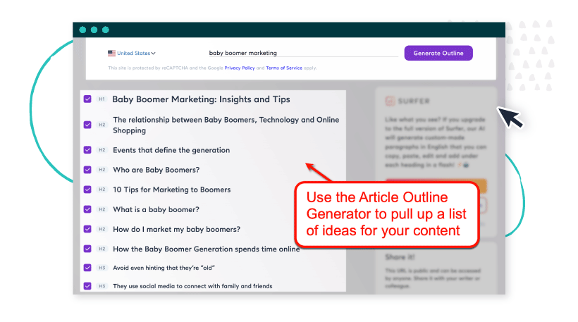 To uncover relevant sections worth including in your content, use Surfer’s Article Outline Generator to generate a list of headings around your target keyword.