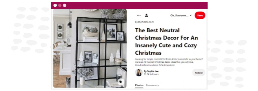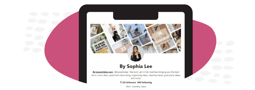 Lifestyle and décor blogger Sophia Lee is an excellent example of leveraging the power of Pinterest to build her brand and presence on the platform. With over 10 million monthly viewers to her profile, her pins have great visuals, clear, direct copy, and two to three hashtags when they’re used within the pin descriptions.