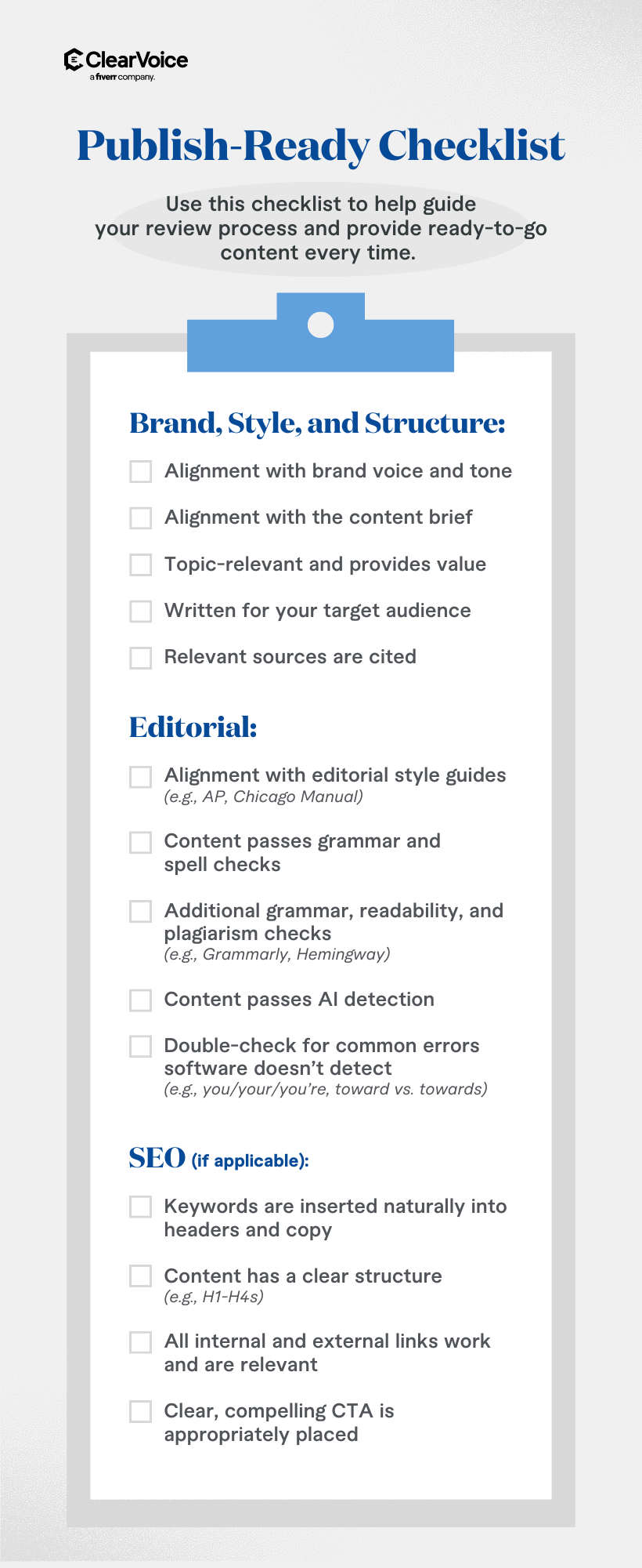 Here’s our go-to, publish-ready checklist for easy access: