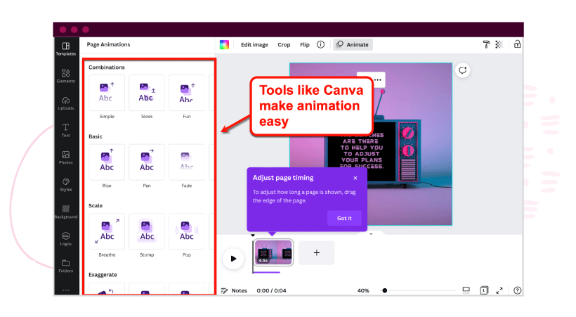 Drag-and-drop design tools like Canva have easy animation tools baked into the platform. It allows you to apply animations to individual graphic elements and plan their timeline.