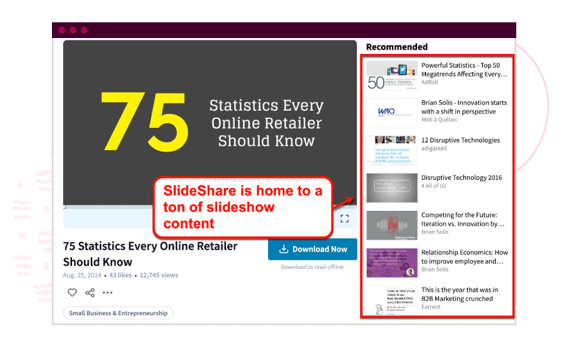 Platforms like SlideShare house a massive pool of slideshow content that countless brands refer to when citing data. That makes slideshows a valuable asset for brand building and traffic generation.