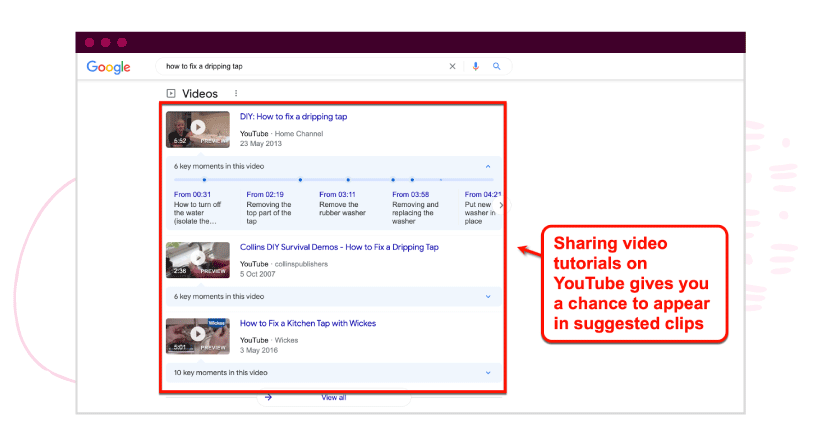 For one, YouTube has tools to help creators publish and optimize their videos. Google also looks at YouTube videos for the “suggested clips”rich snippet.