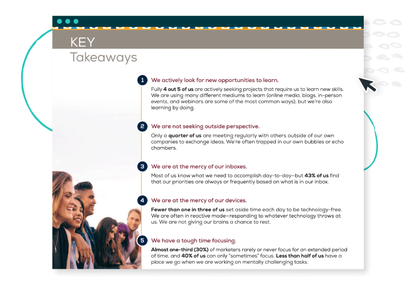 Industry reports contain original data acquired by the brands that publish them. MarketingProfs took it to the next level by finding facts about a topic that no one else talks about: The happiness of marketers.