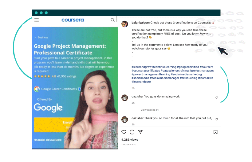 Like the post above by Baig & Baigum, social media content caters to users looking for bite-sized content experiences. The short-form video gets straight to the point and explains the benefits of three online courses — all in a 54-second video.