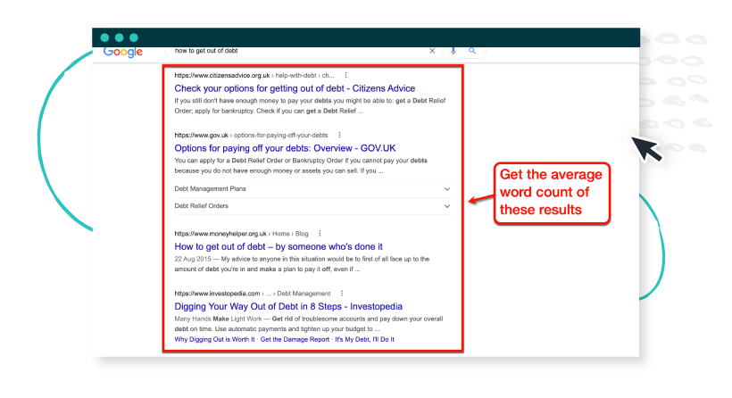 Let’s say you want to rank for the keyword “how to get out of debt.” First, run a Google search and get the average word count of the top 10 results.