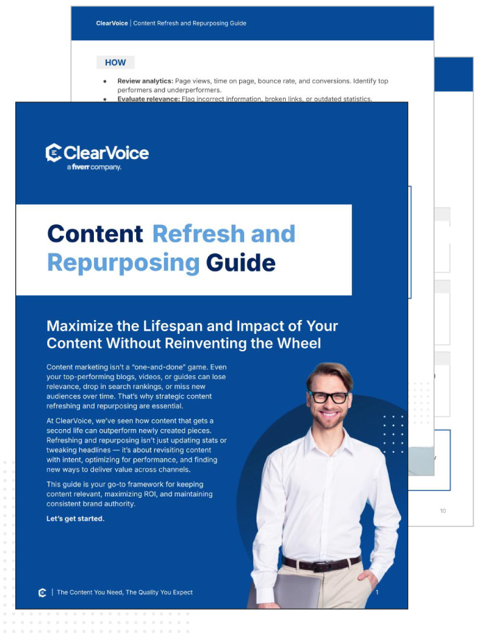 Download the free ClearVoice Content Refresh & Repurposing Guide today and start turning old content into high-performing assets.