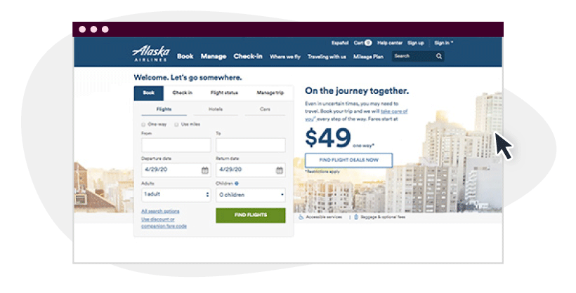 Alaska Airlines focuses on being a socially responsible company that is all about quality and care. In the midst of the COVID pandemic, Alaska’s home page demonstrates their commitment to relationships in being “on the journey together.” They put their customers at ease with the second section of the page, which has a slideshow with safety and wellness features.
