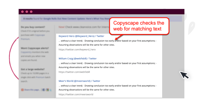 If you purchase content from an agency or outsource freelance writers, use Copyscape Premium to verify the originality of their draft before publishing it on your website. You can also use their Copysentry service to receive automatic alerts whenever copies of your website content are found on the internet.