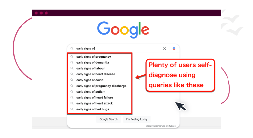 Rather than visiting their nearest clinic, a growing number of patients rely on self-diagnosis through online research. Typical search queries include keywords and phrases like “symptoms,” “how to tell if I have,” and “early signs of.”