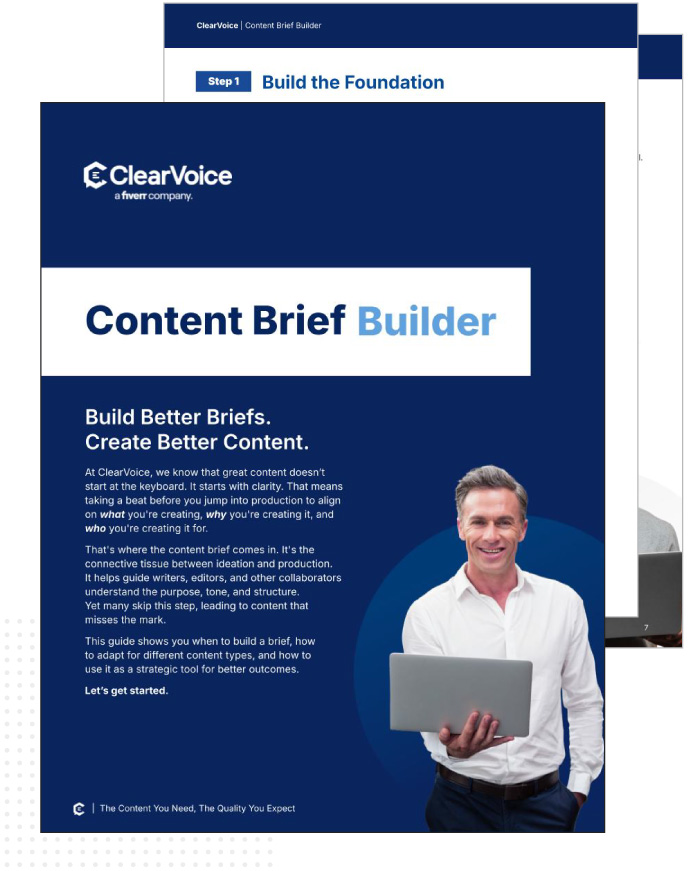 At ClearVoice, we believe the key to great content isn’t just what you create; it’s how you start. That’s why we built the Content Brief Builder: a step-by-step guide to help you create strategic, format-flexible briefs that work for blog posts, social content, videos, emails, and more.